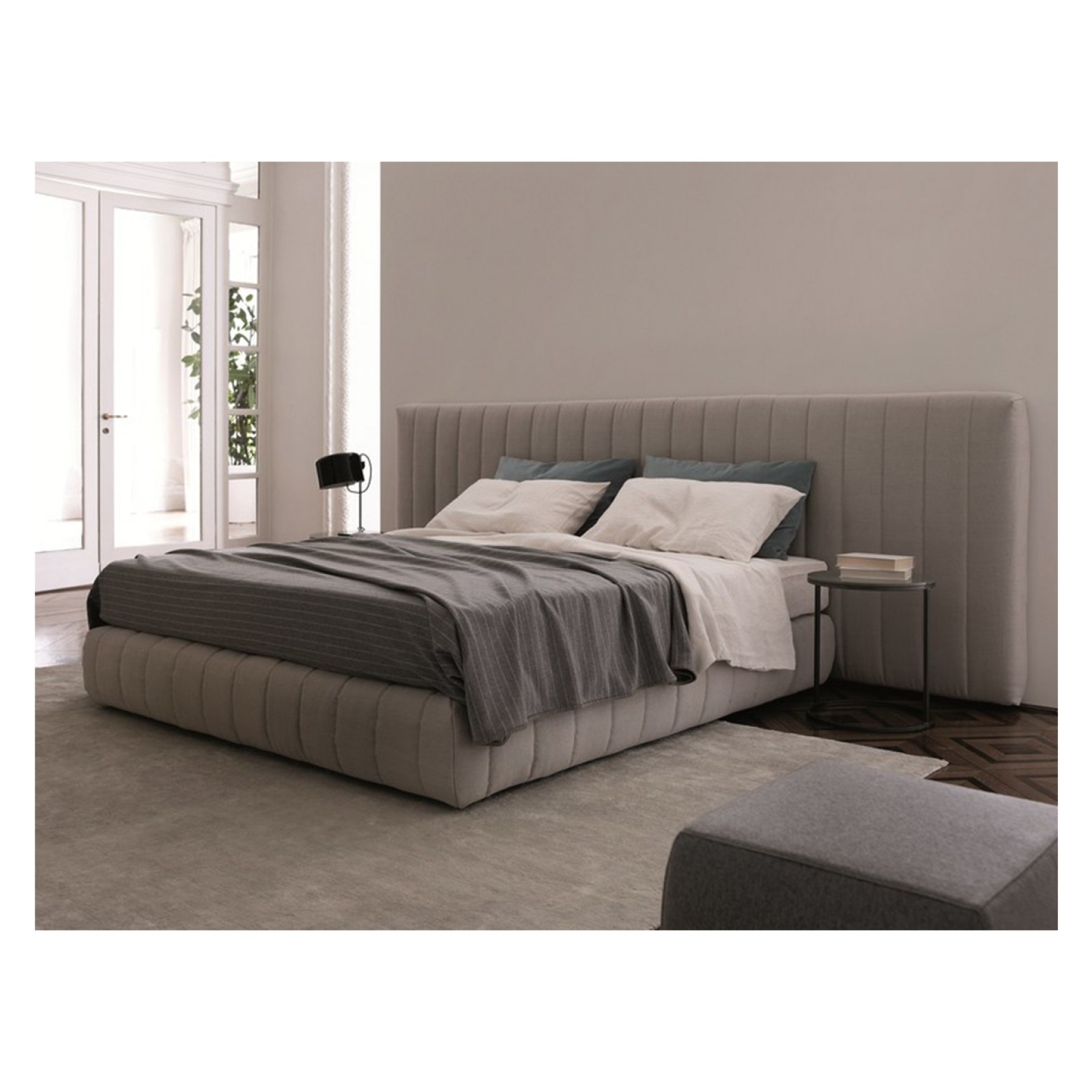 DESCRIPTION: Upholstered wide armed bed, with unremovable cover